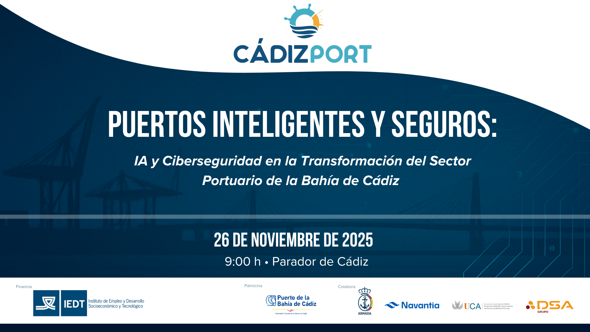 Este miércoles 26 de noviembre, el Parador de Cádiz acogerá el foro “Puertos Inteligentes y Seguros: IA y Ciberseguridad en la Transformación del Sector Portuario de la Bahía de Cádiz”, organizado por Cádiz-Port en el marco del proyecto Horizontes Portuarios 2025, financiado por el IEDT de la Diputación de Cádiz y con el patrocinio de la Autoridad Portuaria de la Bahía de Cádiz.